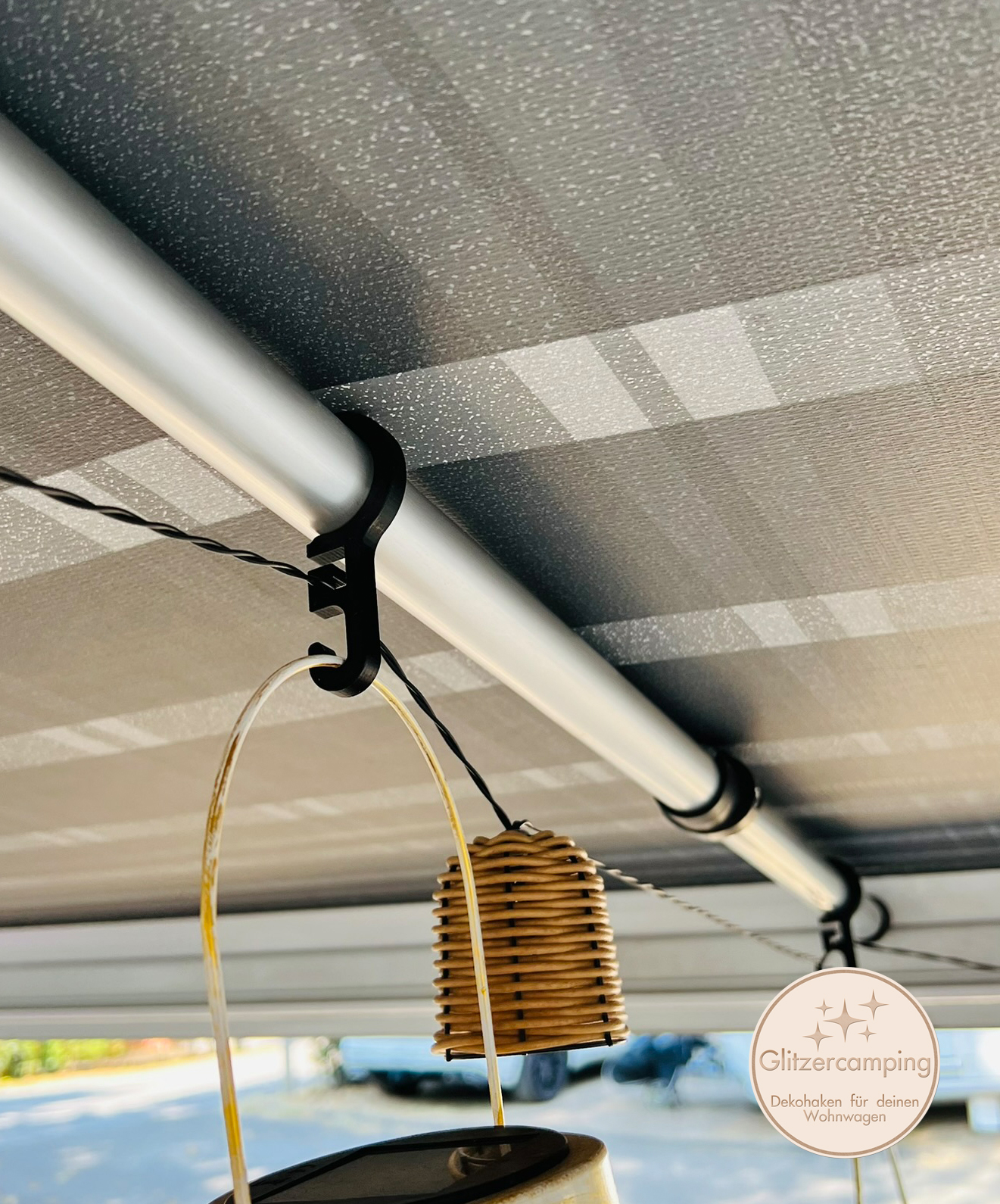 Mit diesen Clips, die an den Stangen im Vorzelt befestigt werden, könnt ihr z.B. Deko zusammen mit einer Lichterkette aufhängen.